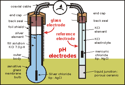 pH Meter 원리: pH값을 측정하기 위해서는 유리전극(Glass Electrode)과 비교전극 (Reference Electrode)이 필요하며, 이 두 전극 사이에서 발생하는 전위차(Potential)를 전압계로 측정함으로써 pH 값을 얻을 수 있다. H+이온이 membrance(얇은 다공성 막)의 Gellayer 부분에 달라붙어 전하를 띄게 된다. 이때 Gel layer가 활성화되어야 H+이온이 잘 달라 붙어 전위가 측정된다.